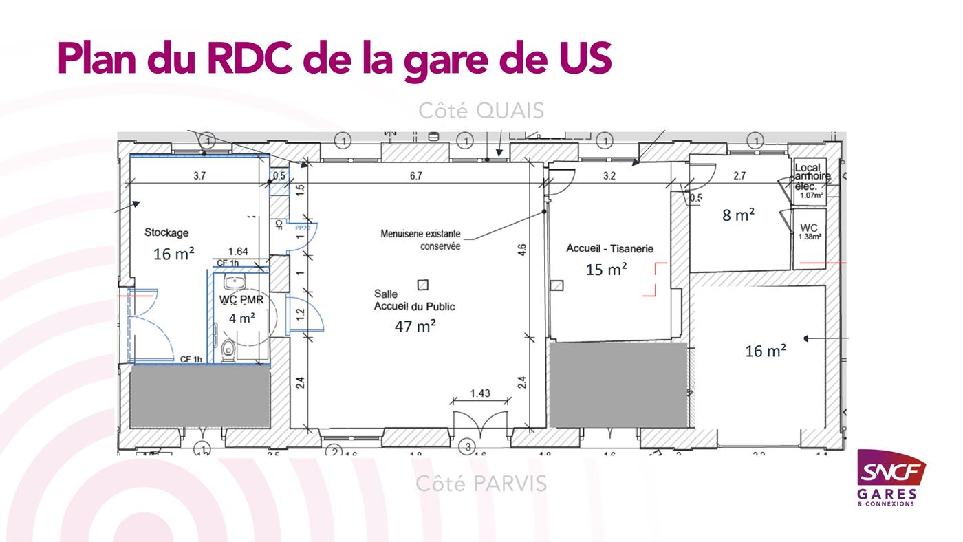 SNCF Gares & Connexions propose à la location un local d'une surface de 108 m² au RDC du bâtiment voyageurs de la gare de Us.